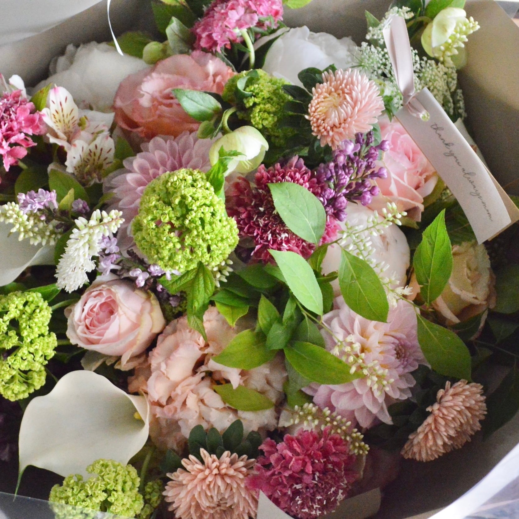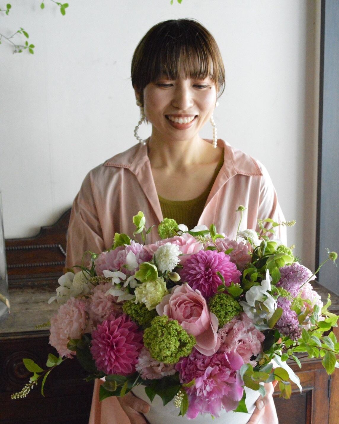 あくまでも写真はイメージとなり、バラやシャクヤク、ダリアなどのお花をメインに、小花やグリーンなどを使用いたしますが、その時の仕入れ状況により花材が変わりますので、基本的におまかせとさせていただきます。