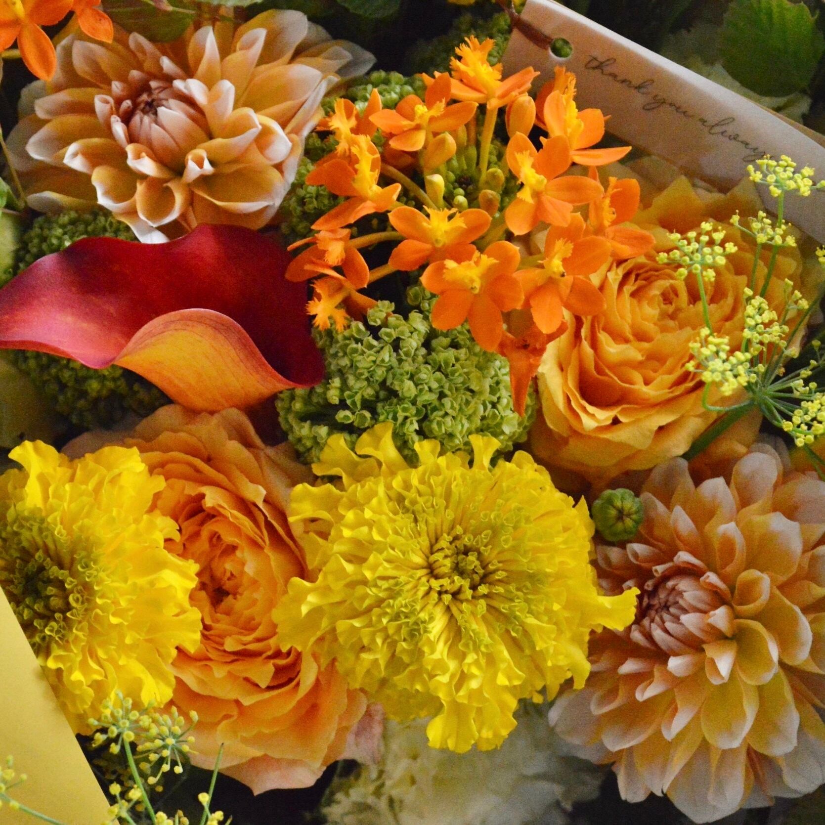 あくまでも写真はイメージとなり、バラやシャクヤク、ダリアなどのお花をメインに、小花やグリーンなどを使用いたしますが、その時の仕入れ状況により花材が変わりますので、基本的におまかせとさせていただきます。