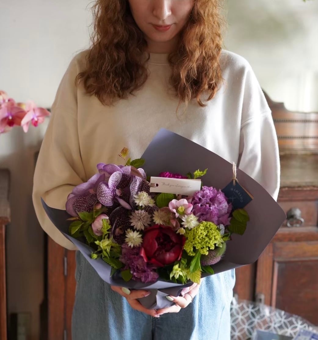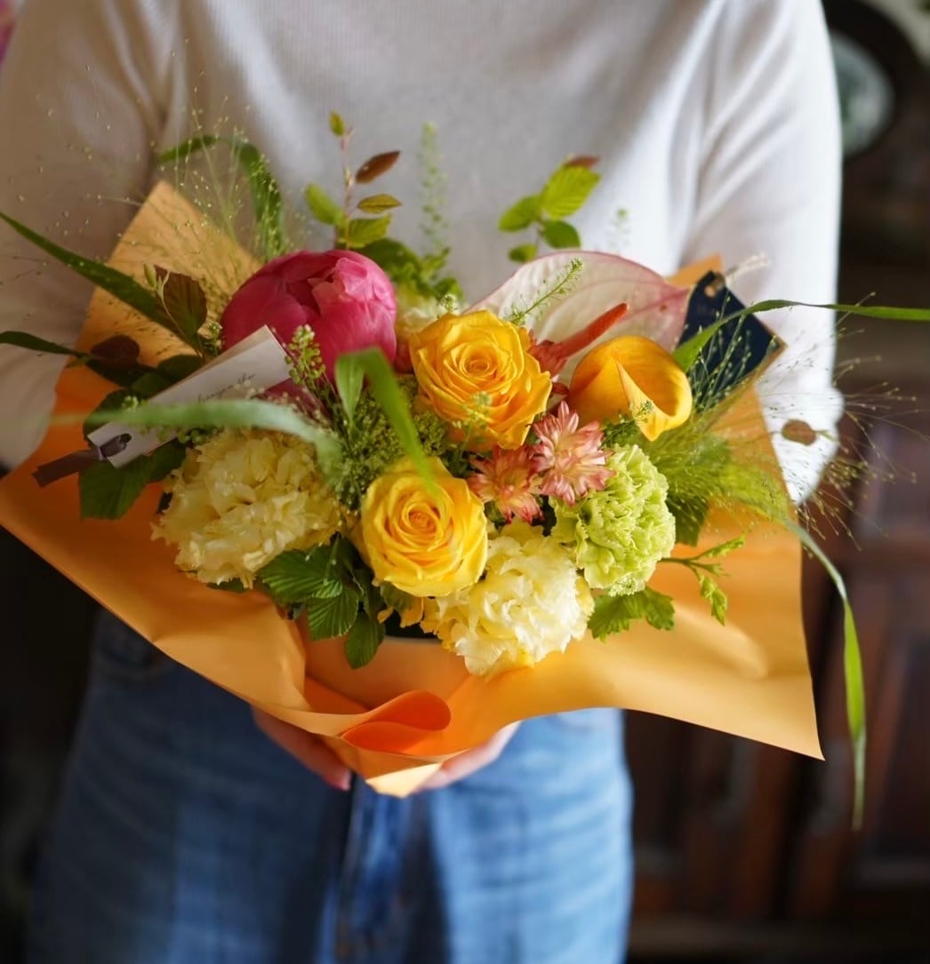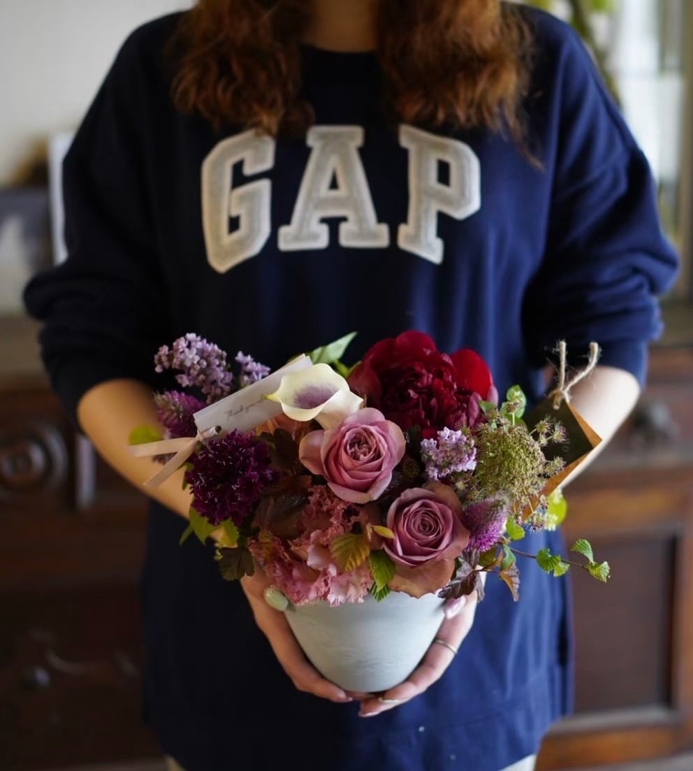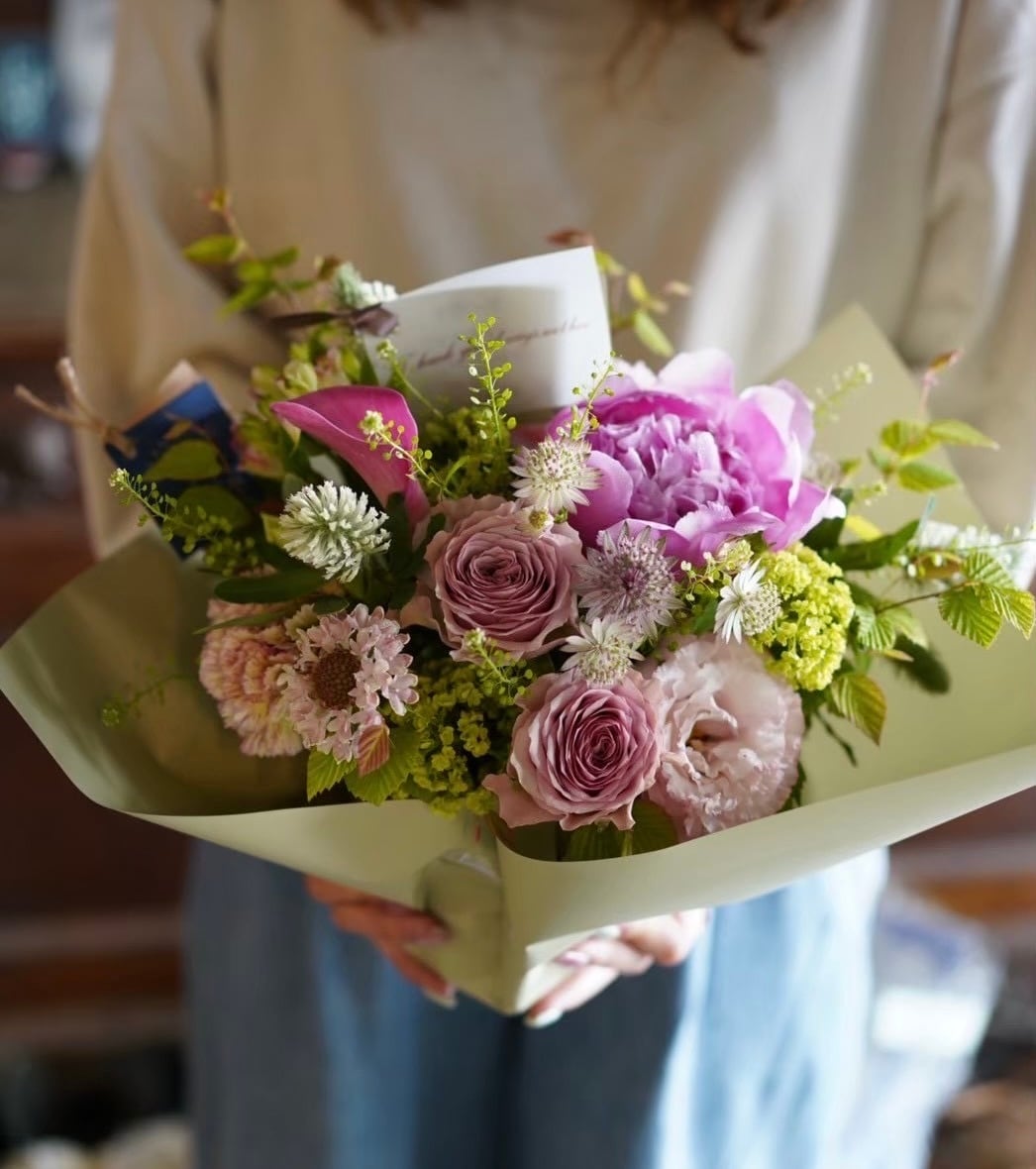 あくまでも写真はイメージとなり、バラやシャクヤク、ダリアなどのお花をメインに、小花やグリーンなどを使用いたしますが、その時の仕入れ状況により花材が変わりますので、基本的におまかせとさせていただきます。