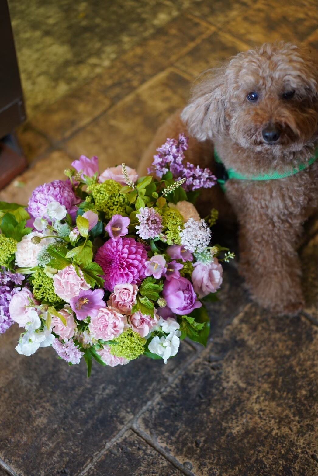 あくまでも写真はイメージとなり、バラやシャクヤク、ダリアなどのお花をメインに、小花やグリーンなどを使用いたしますが、その時の仕入れ状況により花材が変わりますので、基本的におまかせとさせていただきます。